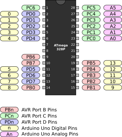 Ports are designated by a letter and pins are numbered starting at 0. For example, the first pin on port B is named PB0 and the third pin on port D is named PD2. Figure 1 shows the names and locations of the pins on the ATmega328P for the PDIP package, as well as the corresponding locations on the Arduino Uno board.
